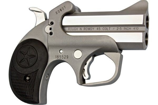 Stainless steel double-barrel and frame Compatible with all standard Bond Arms barrels Automatic spent casing extractor Patented rebounding hammer Retracting firing pins Cross-bolt safety Spring-loaded, cammed locking lever Trigger guard Front blade and fixed rear sights Standard rubber gripRowdy Specs: