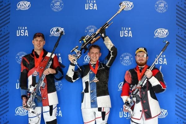 CAPTION L to R: Nick Mowrer, Ivan Roe, and Peter Fiori, the finals medalist of the Men’s 50m Rifle 3 Positions event at Rifle/Pistol Olympic Trials Part one. Photo by Brittany Nelson, USA Shooting