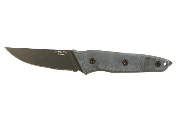 The OKC Stealth has a 3.56-inch blade made of S35VN with 57-59 HRC hardness. S35VN is an extremely tough, high-quality steel which provides superior resistance to wear and chipping while delivering excellent, long-lasting edge retention. The blade has tight serrations for utility. The 9.13-inch overall-length knife has a full tang construction and is covered by a double black micarta handle with a scale pattern for extra grip. The knife handle ergonomics are extremely versatile and comfortable with a distinct taper for striking and shattering when the situation calls for it. The black nylon sheath is molle-compatible and carries easily. This is a superbly balanced and fast-handling knife that is perfect for any situation, from good to very, very bad.