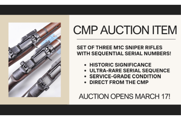 The Civilian Marksmanship Program (CMP) is proud to present a never-before-seen opportunity to own an extremely rare set of three M1C sniper rifles with sequential serial numbers! Beginning March 17, place your bids on the CMP Auction site for your chance to bring home these incredible relics.